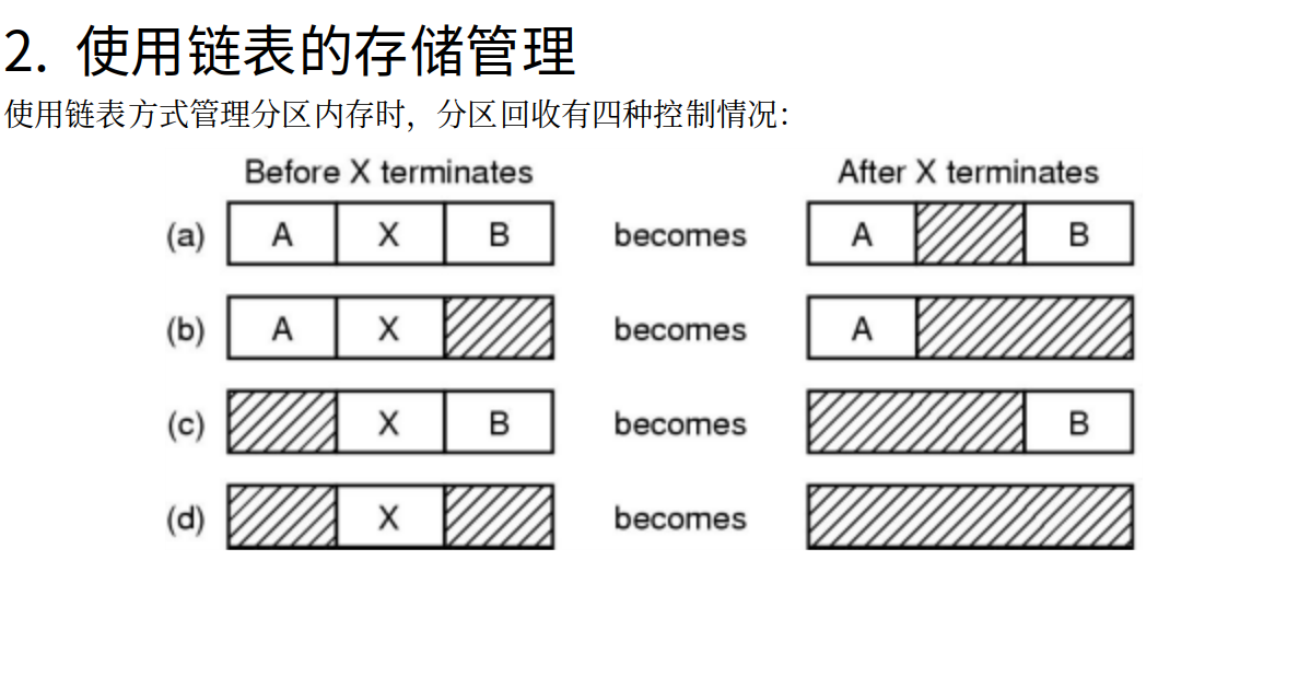 - worst-fit:排序,找到的第一个大于需求的分区就分配,找到的是最大的空闲分区.