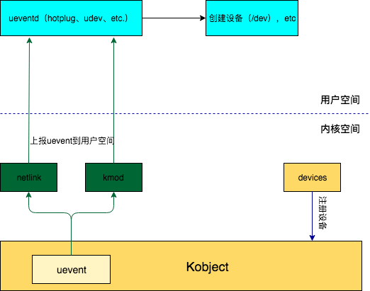 • 占用一条专用socket 由内核发起通知用户 监听等待 设备 。uevent socket.