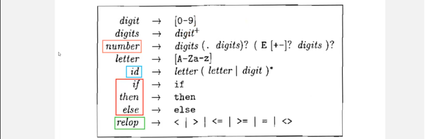 id:字母开头的字母/数字串。id 定义了一个集合,我们称之为语言。语言中的每个元素被称之为串(标识符)。 语言是串的集合 可以集合操作构造新的语言,