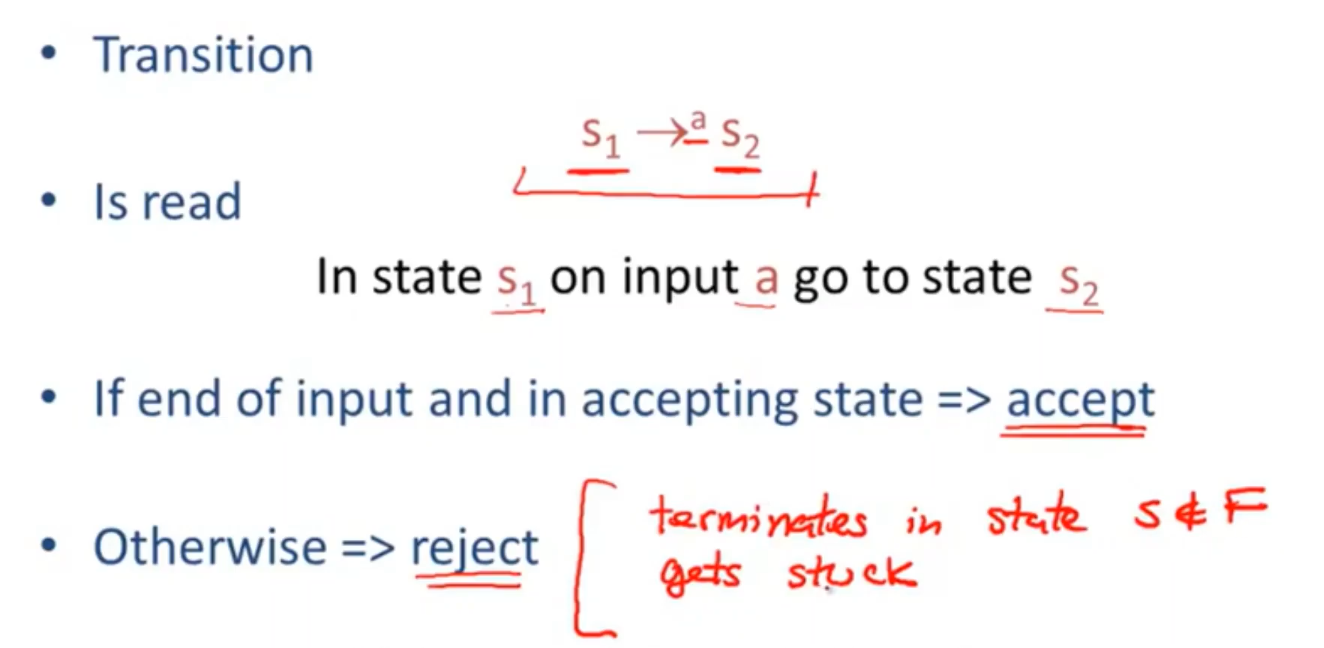 - 两种情况,到达输入的末尾但是自动机未处于最终状态,或者由于卡住而永远不会到达输入的末尾