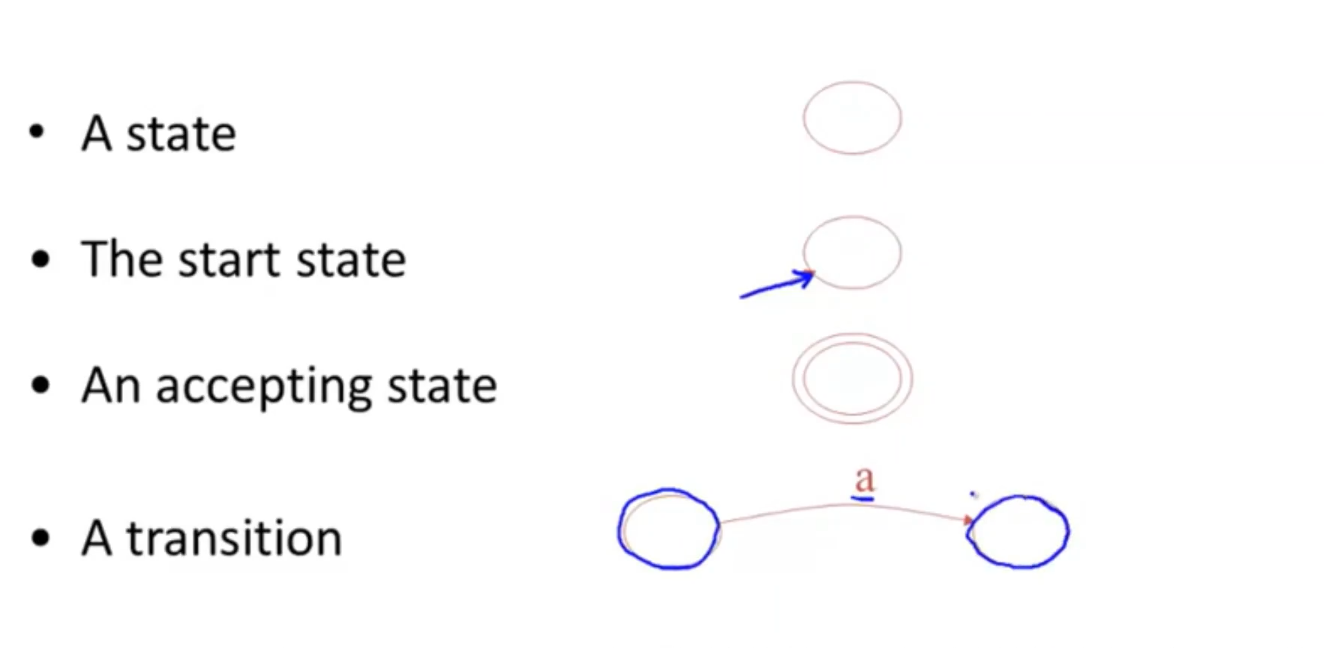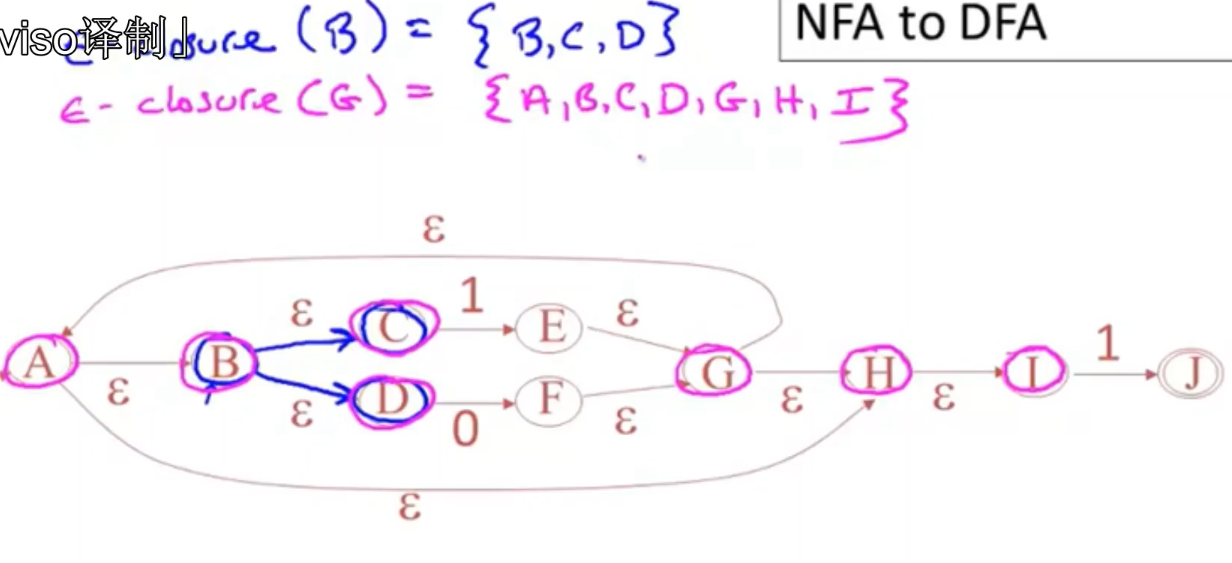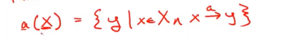 - 转换函数transition function:给定一个状态集X,展示通过输入字符a可以到达的所有状态。a(a character) apply to a set of states.