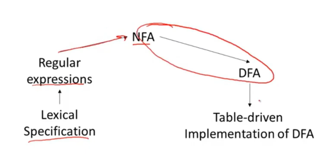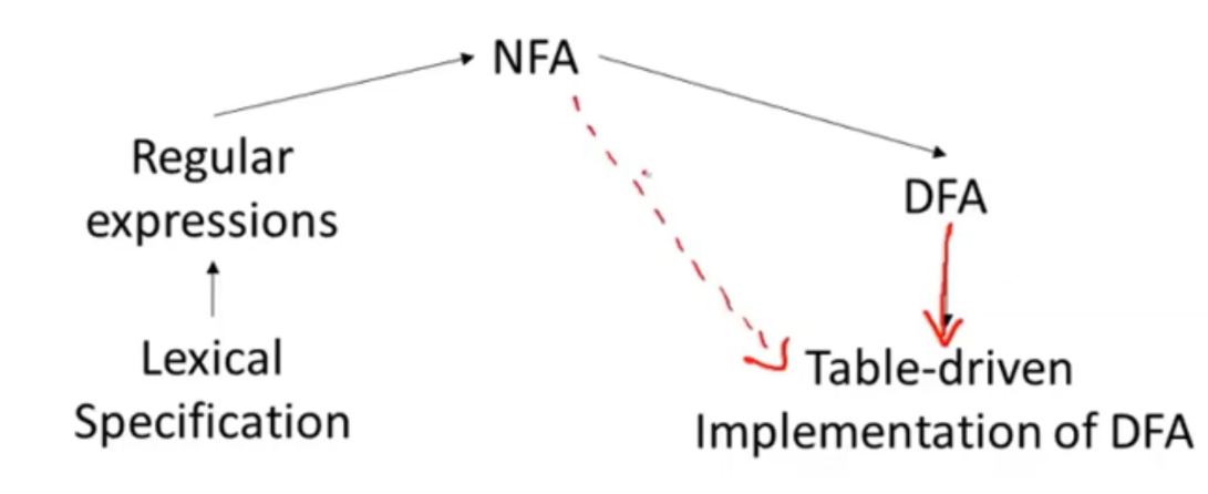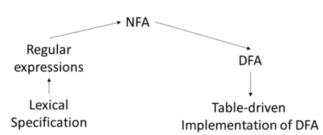 - 实现词法规则的关键思想时 将非确定性有限自动机转换为确定性有限自动机