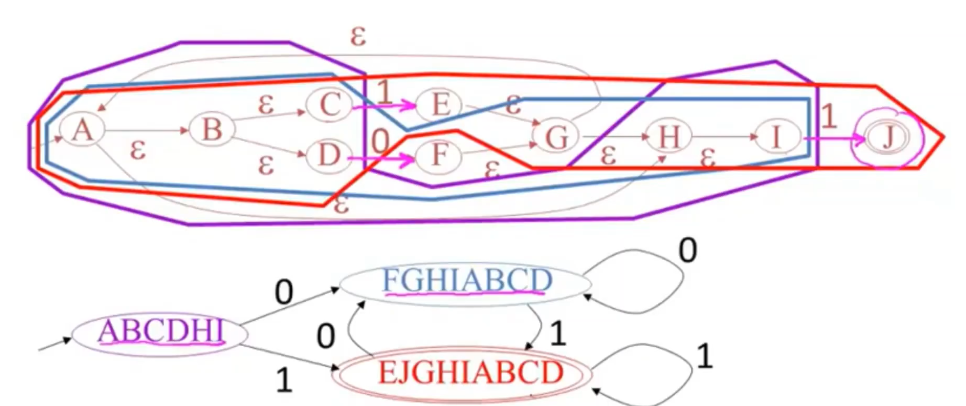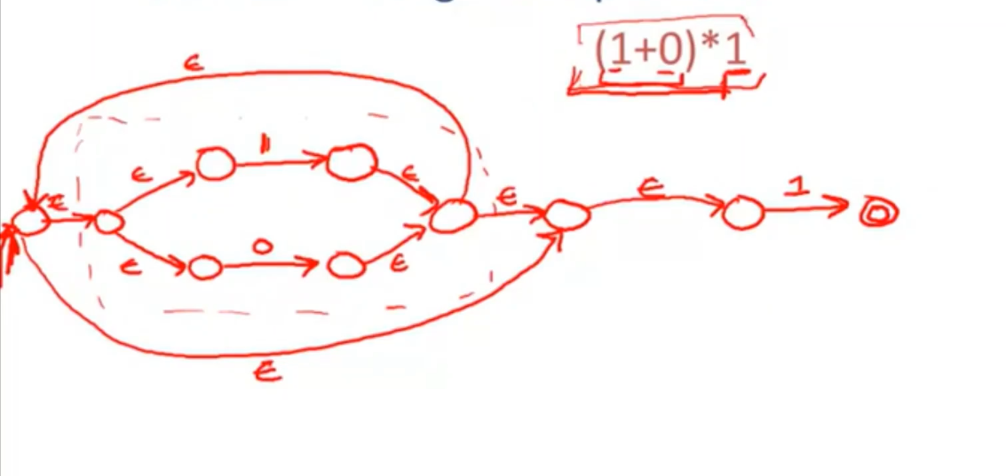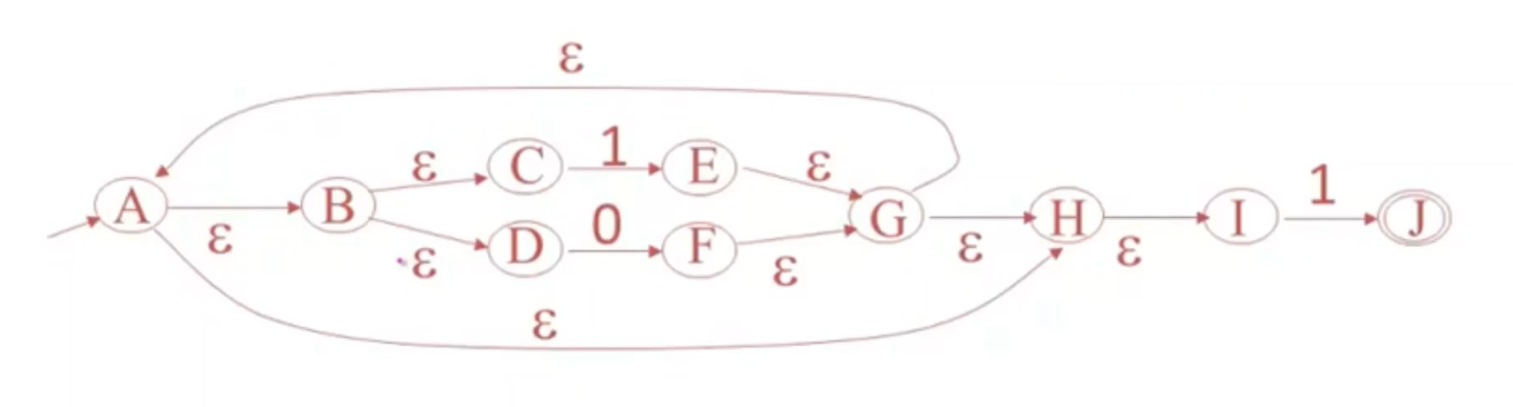 - 一个自动机接受0/1 ,然后整合进一个自动机 既接受1又接受0,通过空跳回到这个组合自动机的最终状态。然后进行迭代。