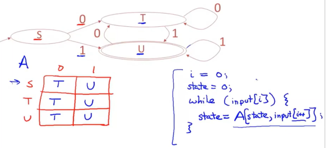 while(input[i]) 当数组中的元素不为空时 ,在每一步更新状态,怎么更新?在转换关系数组A中进行查找,如何查找?先查找当前状态,再去查找输入,通过使用当前状态和当前输入,我们就能确定一个新的转换状态。同时,输入指针自增。loop that processes an input according to the transiton table A