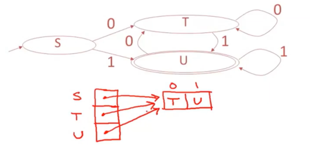 - a DFA can be implemented by a 2D table T 二维数组的形式