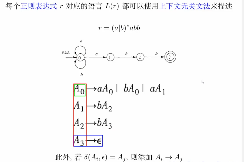 1. 每个正则表达式r对应的语言L(r)都可以使用上下文无关文法来描述。