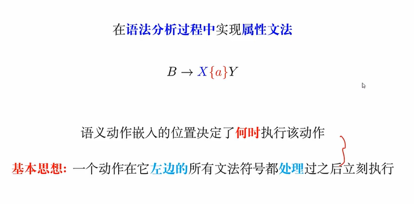 在语法分析过程中实现属性文法。计算属性的动作嵌入到语法分析过程。