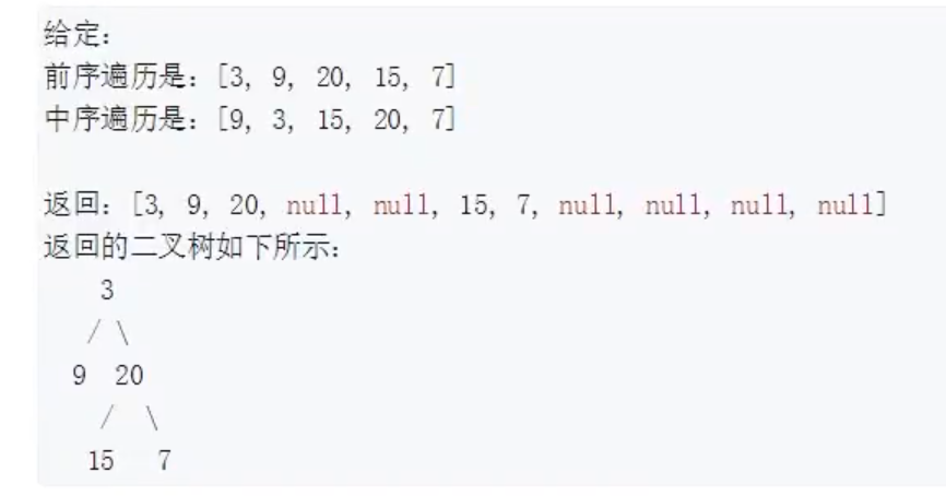 • 注意:二叉树中每个节点的值都互不相同;输入的前序遍历和中序遍历一定合法