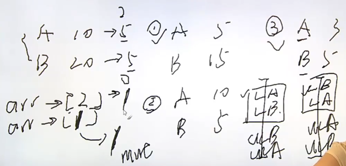 信号数组 2 ,每个信号量为1→两个互斥量, 原子操作 锁a和锁b,否则死锁