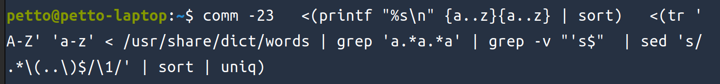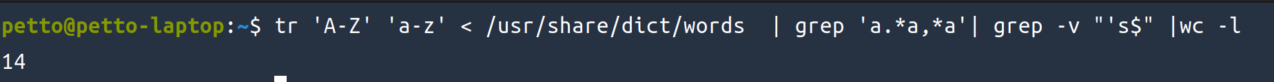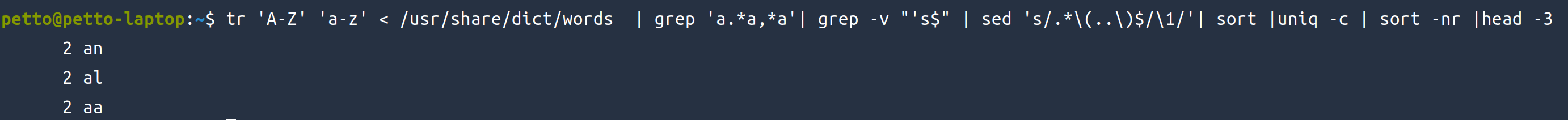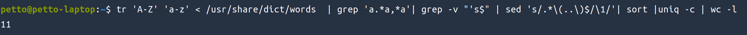 /usr/share/dict/words) 中包含至少三个a且不以's结尾的单词个数。这些单词中,出现频率前三的末尾两个字母是什么?sed的y命令,或者tr程序也许可以帮你解决大小写的问题。共存在多少种词尾两字母组合?还有一个很 有挑战性的问题:哪个组合从未出现过?