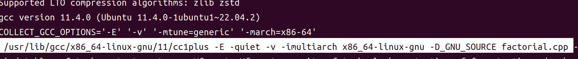 • gcc -E factorial.cpp —verbose > /dev/null查看详细工作流程