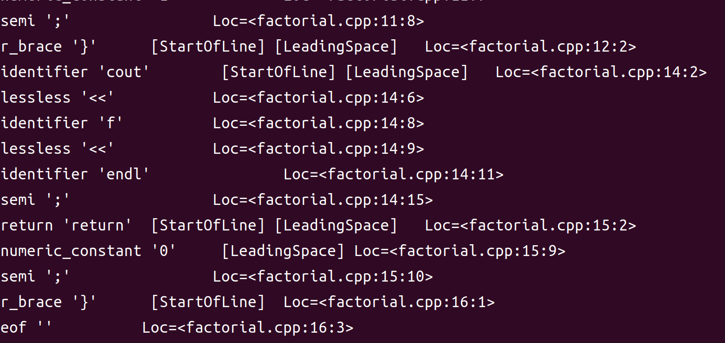 • 两种命令 一种是利用之前生成的预处理文件来进行词法分析clang++ -fsyntax-only -Xclang -dump-tokens factorial.ii; 另一种是从源文件开始预处理加词法分析`clang++ -E -Xclang -dump-tokens factorial.cpp