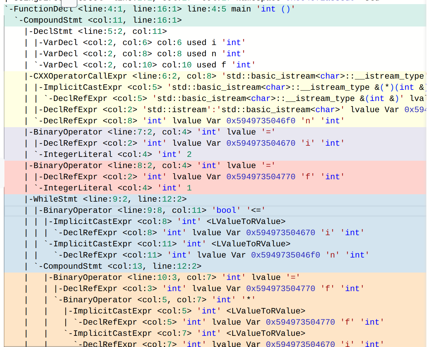 • `clang++ -Xclang -ast-dump -fsyntax-only factorial.cpp