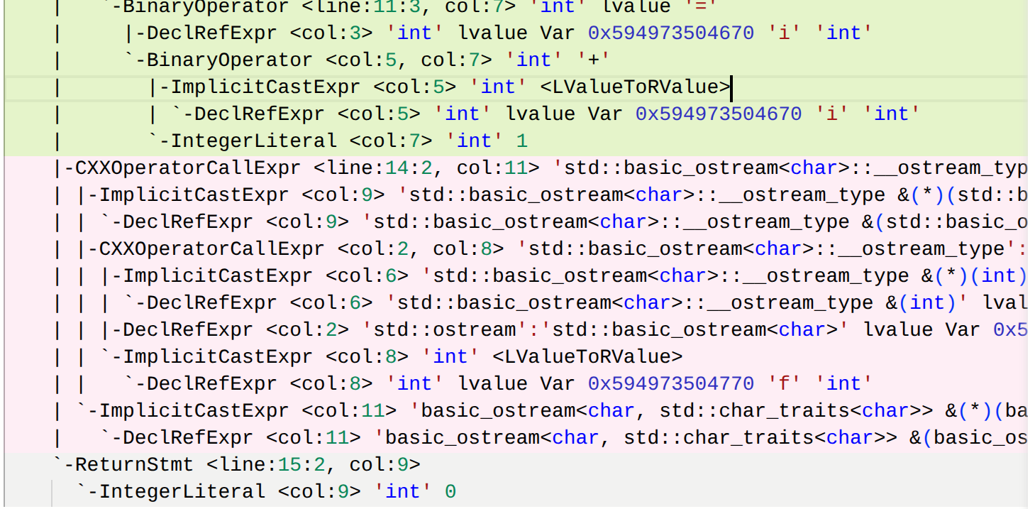• 多个 << 是从左到右依次调用的。最外层的c++operatorcallexpr调用<<,左参数是cout<<f(嵌套的操作符调用),右参数是endl(函数模板)