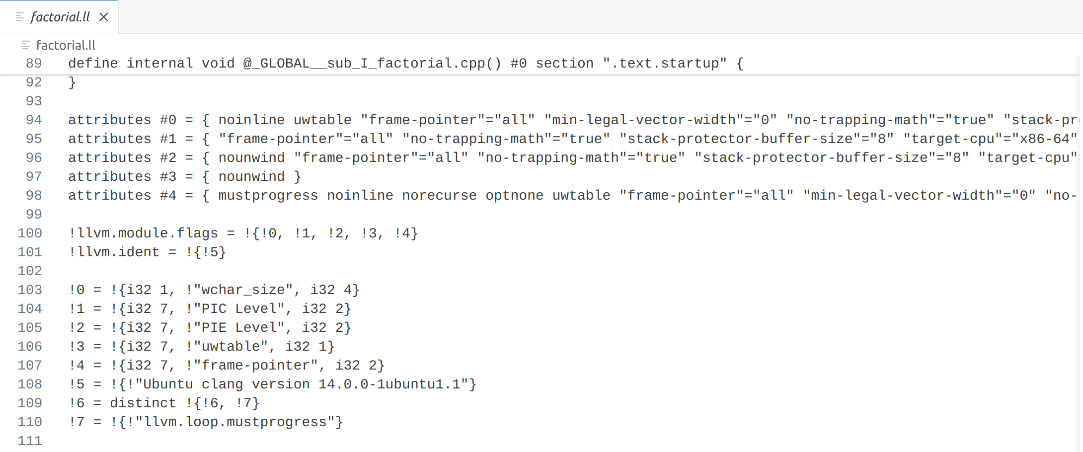 使用命令clang++ -S -emit-llvm factorial.cpp生成后缀为ll(low level)的文件