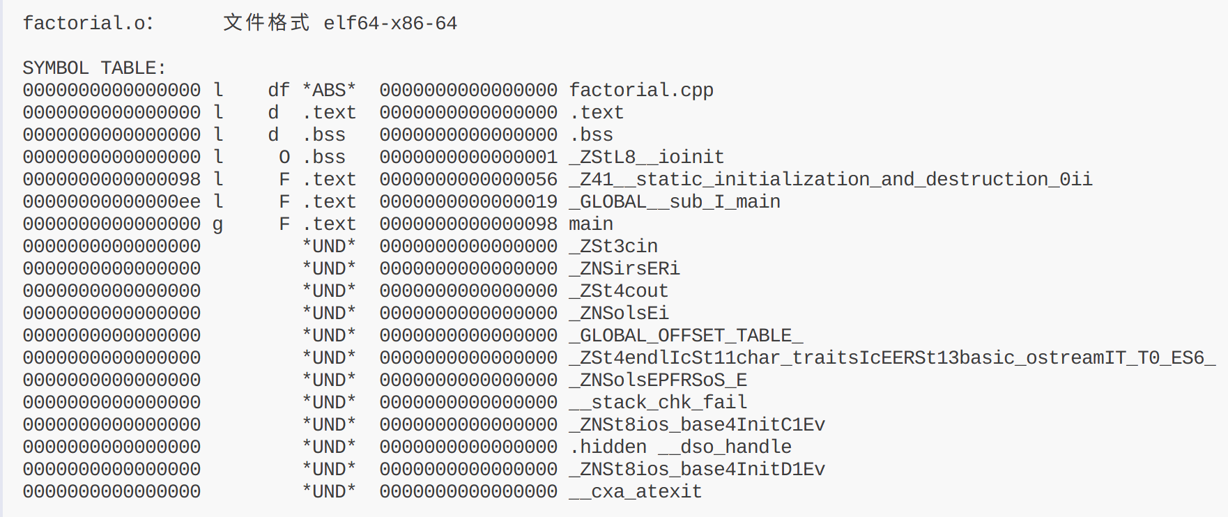 使用命令查看符号表 objdump -t factorial.o