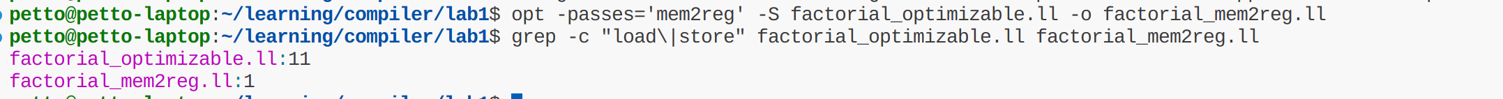 1. 内存访问优化:将堆栈变量提升到寄存器 当我们执行命令 opt -passes='mem2reg' -S factorial_optimizable.ll -o factorial_mem2reg.ll,该优化减少了从内存读取数据的指令数量,从原来的11条变成了1条