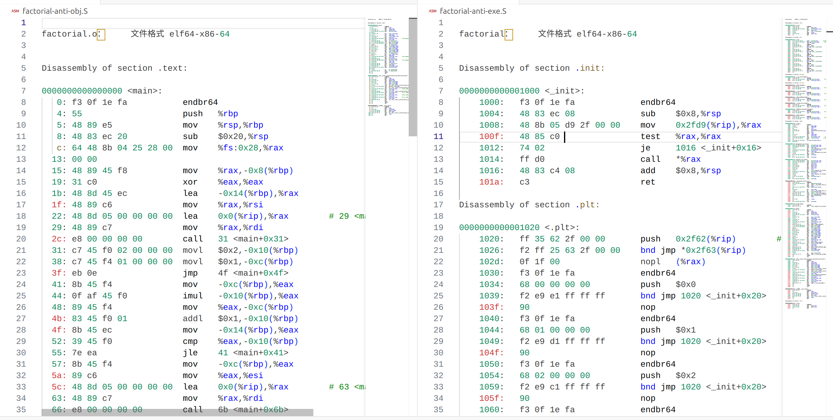 链接器的工作是将多个可重定位机器码文件组合成单一程序,解决外部引用(变量、函数),输出符号表 使用命令g++ -O0 -o factorial factorial.o 使用命令objdump -d factorial > factorial-anti-exe.S 进行反汇编, 与之前生成的结果比较,发现exe包含所有的节从开始的init到结束的fini,而目标文件只有text的节。同时在上一阶段没有填充的地址也赋值了。代码的地址也从0x0000变成了从0x1000开始