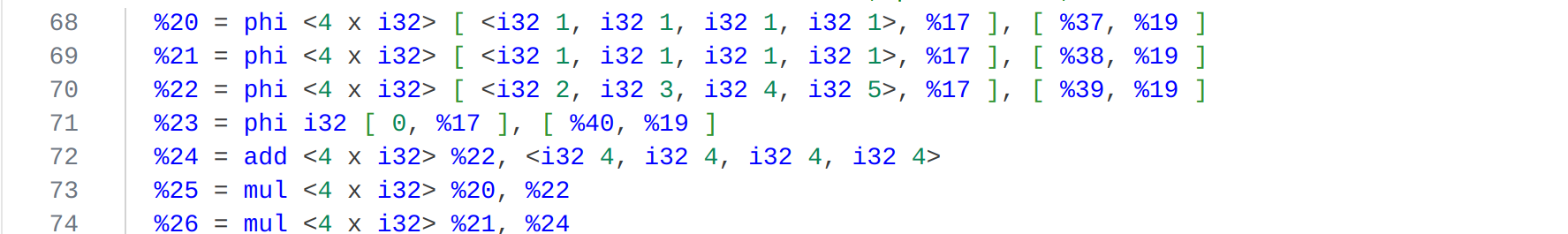 该pass将小于等于时循环的条件改成了大于时退出,逻辑上是等价的,这种更改是符合大多数编译器规定的格式。(满足某个条件时退出) 第二个改动是将加法指令添加nuw(no unsigned wrap)标记。 优化前%8 = add nsw i32 %.01, 1 ; i = i + 1 优化后%7 = add nuw nsw i32 %.01, 1 ; i = i + 1 循环变量i从2开始且递增,因此它永远不会发生无符号整数溢出。 若我们使用-O2级别的优化,命令clang -S -emit-llvm -O2 factorial.cpp -o factorial_O2.ll 注意到 编译器引入了<4*i32i>向量类型,并使用了相应的向量指令来对循环计算向量化,充分利用了现代CPU的SIMD(单指令,多数据流)处理单元。一次性完成4次乘法。