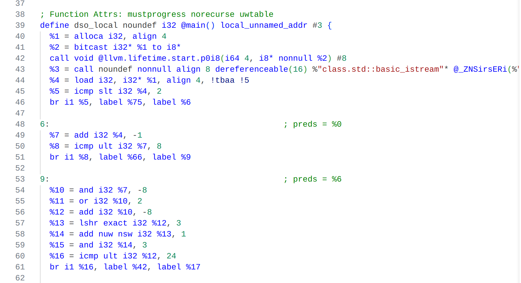 br i1 %5, label %75, label %6 ; n < 2 直接返回1 br i1 %8, label %66, label %9 ; 小循环处理 br i1 %16, label %42, label %17 ; 向量化处理